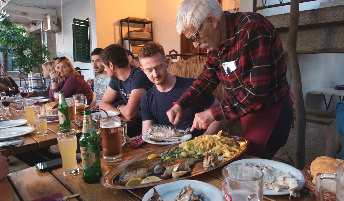 Zvečer se je naša baza prestavila k Dinkotu, ki nam je postregel z okusnimi ribami. Dinko je sicer legenda, ampak tam nismo prav dolgo zdržali. Vrnili smo se v udobje našega kampa in druženje se je nadaljevalo na stolčkih pred šotorom. Čeprav smo vedeli, da nas čaka naporen dan, se krog še dolgo v noč ni zmanjšal.