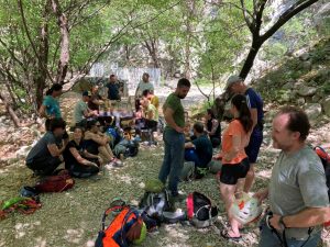 V soboto zjutraj smo se ob 8.00 odpravili iz kampa do parkirišča v kanjonu, od koder smo peš nadaljevali do lokacije delavnic. 20-minutni dostop je poskrbel, da smo se ogreli na delovno temperaturo. Nato smo se razdelili v skupine po 2 ali 3 in se izmenično zvrstili na delavnicah: