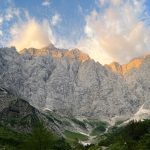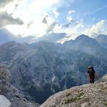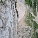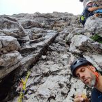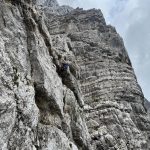 Plezanje je bilo uživaško. V vstopnem delu sicer bolj krušljivo kot v zgornjem, a vseeno panoramskih razgledov ni manjkalo. Pod Bavarskim turncem smo ujeli Ljubljanski vlak, zato smo ta čas izkoristili za kosilo in opoldanski počitek. Zatem smo se naveze oddaljile druga od druge, k čemur je prispeval tudi najin zavozlan štrik. Celotna smer je zelo dobro opremljena s klini, tudi tam kjer smer ne pelje načrtovano. Posledično sva si z Bazotom pomagala s skico, saj prvenstvena v severni steni poleg sendvičev ni bila na meniju 😊.  Ko sva prišla iz smeri, sta ostali navezi že počivali, a sledila je še poslastica! Izstop Zimmer-Jahn smo hitro premagali, le zadnji delček pa nam je ponudil malo izziva.