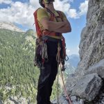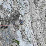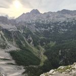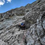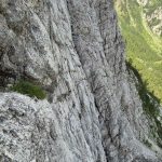 Zgornji del pripelje do izrazitega kamina, ki pa je od vseh raztežajev najbolje opremljen s klini. Slednjega glasno prepiham in si oddahnem šele na zagozdenem balvanu in sidrišče naredim nekaj metrov višje na nekakšni polički. Izstop iz kamina vodi po desni strani čez luknjo, kjer si morava odpeti nahrbtnika in si jih vrževa naprej, ker je tako ozka, da drugače ne gre 🙂. Zadnji ratežaj ostaneva navezana, ker je vseeno treba še malo poplezati in prečiti v levo. Po dobrih 10h plezanja si čestitava in sva vesela, da naju na izstopu še greje sonce. Malicava nekaj metrov nižje na travi in debatirava, kako so to plezali včasih, res vsaka čast. Sledi še sestop nazaj do Studorskega prevala in vse do Rudnega polja na Pokljuki, kjer po 16,5h turi paše odložiti nahrbtnik. Ker sva bila še dosti hitra, dobiva v hotelu hladno pivo in poslušava tekmo finala svetovnega prvenstva v nogometu na terasi ter analizirava turo.
