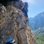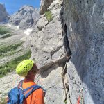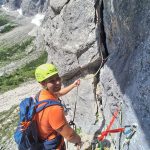 Plezalno idilo je nekajkrat prekinilo samo padajoče kamenje. Po dobrih petih urah smo prišli iz smeri na vrh, vmes smo malo čakali na predhodno navezo, saj so se zaplezali v enem izmed raztežajev.