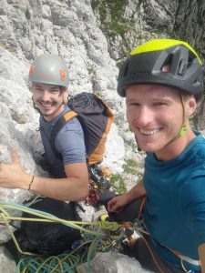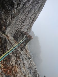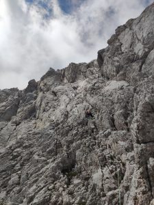 Kmalu se mu pridružim in nadaljujem levo ob previsu navzgor, kjer zagledam klin. Višje je trenje preveliko zato naredim štant. Oba klina lepo zapojeta in hitro se mi pridruži še Jure.