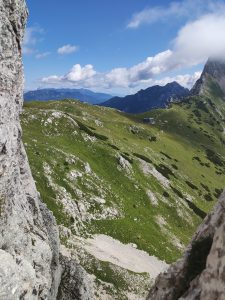 Pred nama je še samo zajeda in platka, ki vodi iz smeri. Nik prevzame zajedo, mene pa čaka še zadnja plata. V srednjem delu smeri nama je razgled pokvarila oblačnost, ki se je na srečo razkadila v plati ter mi ponudila lep razgled. Poleg odličnih razpok in malih poličk, ki ti ponujajo hitr in varen vzpon te presune lep razgled na kočo ter Planjavo.