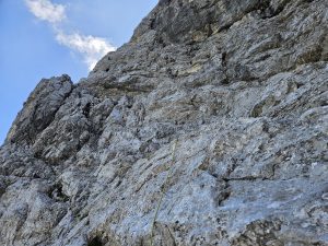 Po prehojenem prvem delu poti PP, se lepo odpre pogled na celotno smer in že primerjamo skice in vrise smeri. Pod smerjo ugotovimo, da je pred nami že ena naveza. V miru pomalicamo in se počasi pripravimo na vstop. Prvih nekaj metrov smeri nas ogreje, nato sledi lepo plezanje po kompaktnem kaminu. Ostali del smeri je, z izjemo zgornjih platk z oceno V, bolj kot ne krušljiv. V zgornjem delu je še zmeraj notri prusik, ki te usmeri na pravo (zgornjo) polico. Od tu, po prepleznih 8m navzgor, sledi prečka v levo do kamina, ki te pripelje do izstopa smeri.