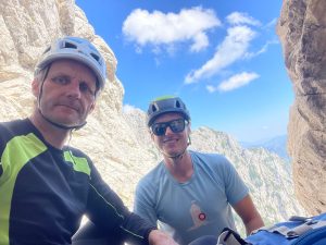 Osnovna ideja je bila plezati Nemško smer. Vendar plezanje v steni vseh slovenskih sten v obdobju dopustov ni več za normalno ceno. V vodniku Slovenske stene Tineta in Rudija sva našla stavek, da je Steber Štajerske Rinke soroden Nemški smeri. Kako pak, zvečer na klubsko kočo, zjutraj v smer. Po letošnji vodni ujmi tam gor, je dostop na Okrešelj in morfološka situacija višje, eldorado za pričevalce zgodovinskih okoljskih sprememb. Dejansko je tudi vstop v smer Steber Štajerske Rinke kakšne 2 metra poglobljen.  Višje v smeri tovrstnih sledov ni, do višine prve polovice smeri je krušljivost dejstvo iz drugega zgodovinskega obdobja . Ko se kompaktnost skale izboljša, se zgodi nekje na sredini spodoben detail IV+, z dovolj klini, sicer so zelo redek pojav. Sledi še nekaj enostavnejšega plezanja do vrha stebra pod glavo Štajerske rinke. Tam sva potegnila v levo (pohodno) po čisto zgornjem robu melišča do stene med Malo in Štajersko Rinko. Te zapore je cca 80m, spodobno opremljenih s klini, zahteva pa plezanje IV+. Sestop v smeri Male Rinke in v Turski žleb. Žleb je še običajno prehoden po pletenicah. Le pot ob zaspanem hribu je zabrisana s trdim plazom peska in kamenja.