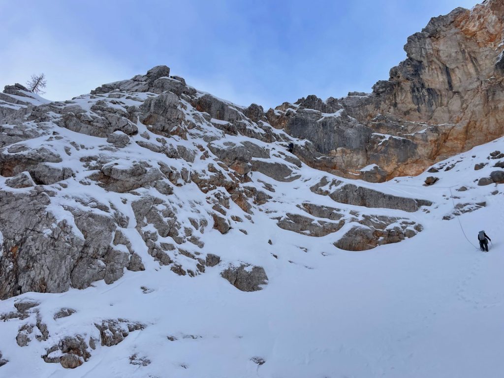 Novice se širjo danes večinoma elektronsko. Mi smo imeli interne informacije iz dneva prej, kako in kaj v dolini Ravenske Kočne na Jezerskem. Tri naveze smo si zadale tri cilje. Nas pa niti ni presenetilo, da je ta dan pod Dolgim hrbtom nastal neformalni mednarodni festival zimskega plezanja. Za uvod se je izkazalo, kot ustrezno, oditi zgodaj od doma, da smo bili med prvimi pod steno.