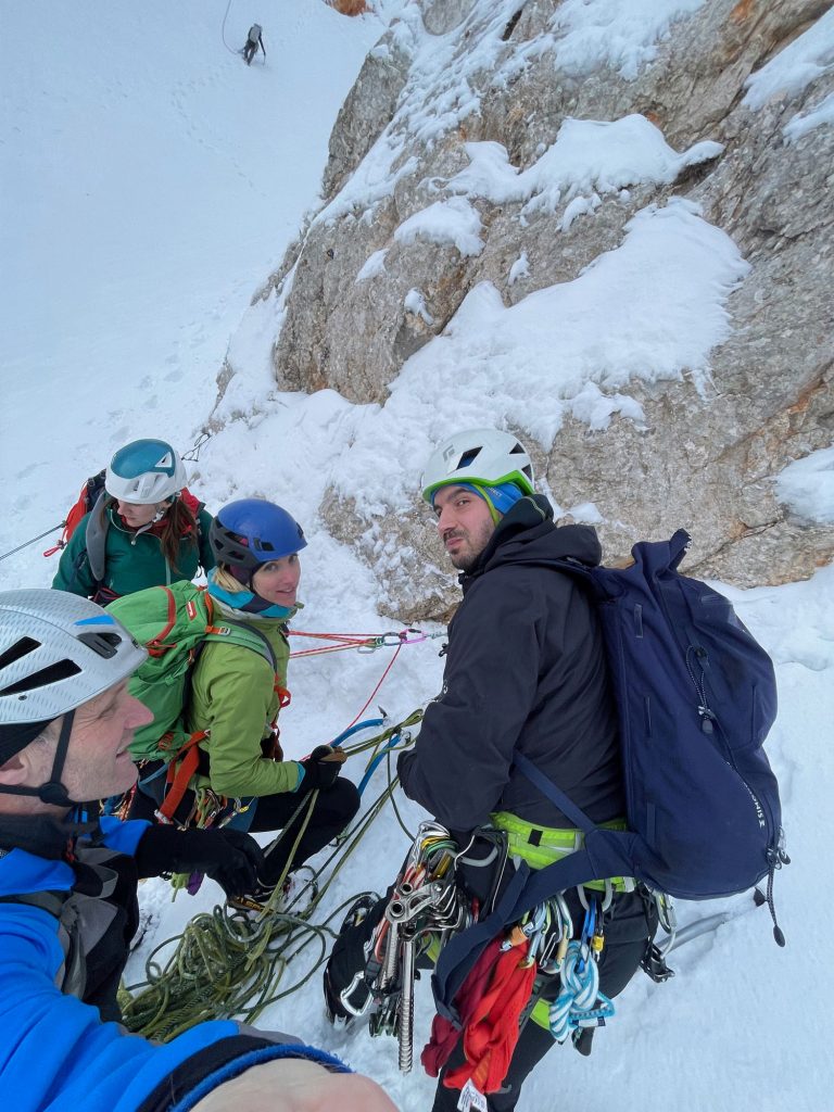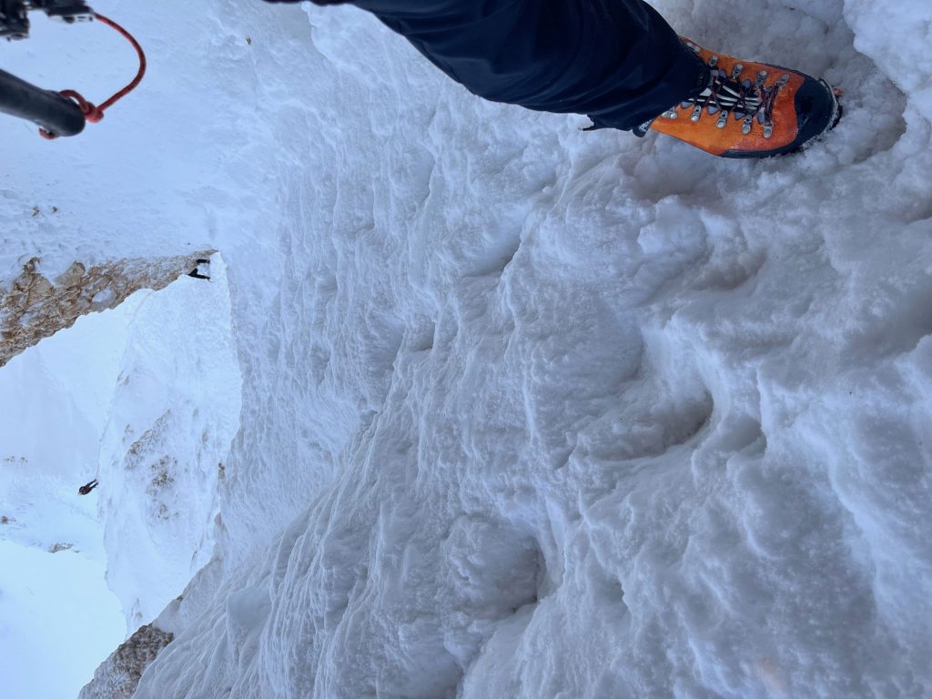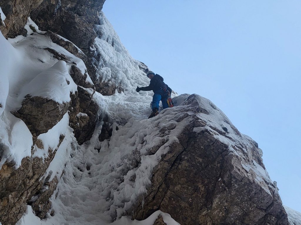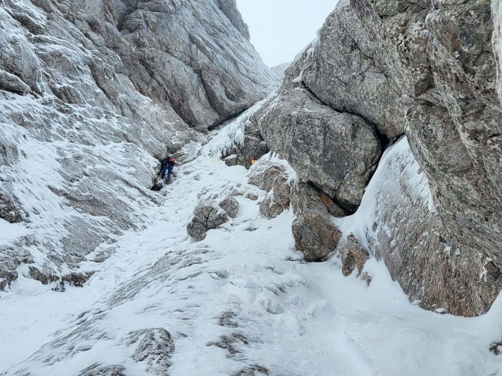 Pri spodmolu za vstop v Teranovo smer smo si ogledali sestop v žrelo, vidne so stopi. Ok. Do tretjega raztežaja, kjer je največ naklonine se je plezalo po ugodnem pomrznjenem snegu, bile so možnosti za varovanje z lednimi vijaki v ledu. Ker smo bili trije, so nas neučakanci, ki so prihajali v trumah začeli dohitevati. Potrebno se je reprogramirati, da do izstopa iz smeri bo pač tako, da plezamo med štirimi do sedmimi prameni vrvi. Sredi smeri Tilenu predam vodstvo, tam se začne grapa in štirje raztežaji do vrha. Skozi grapo in do konca predzadnjega raztežaja so možnosti za varovanje slabše, je pa naklonine manj. Slovita prečnica, kot zadnji raztežaj za izstop iz smeri je ugodno uhojena, najde se dovolj vmesnih klinov. Spusti se zastor – rahla napovedana popoldanska megla in sestopamo proti Kranjski koči na Ledinah. Na sestopu, na vstopu v žrelo se ta hitri in počasni zopet zberemo. Samooklicani hitri na celotni tuti, postanejo povprečni. Med našim vzponom sem v smeri naštel kakšnih 30 plezalcev. Največja nevarnost na vzponu ja bil najbrž ego človek proti človeku, nobeden ni odletel, nazaj na parkirišču vse skupaj postane nepomembno.