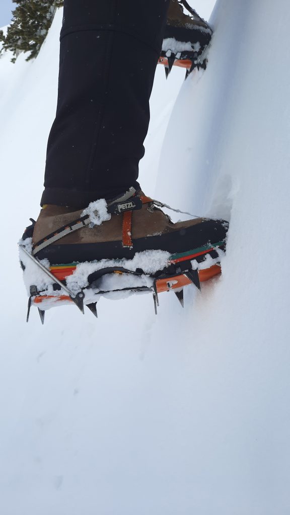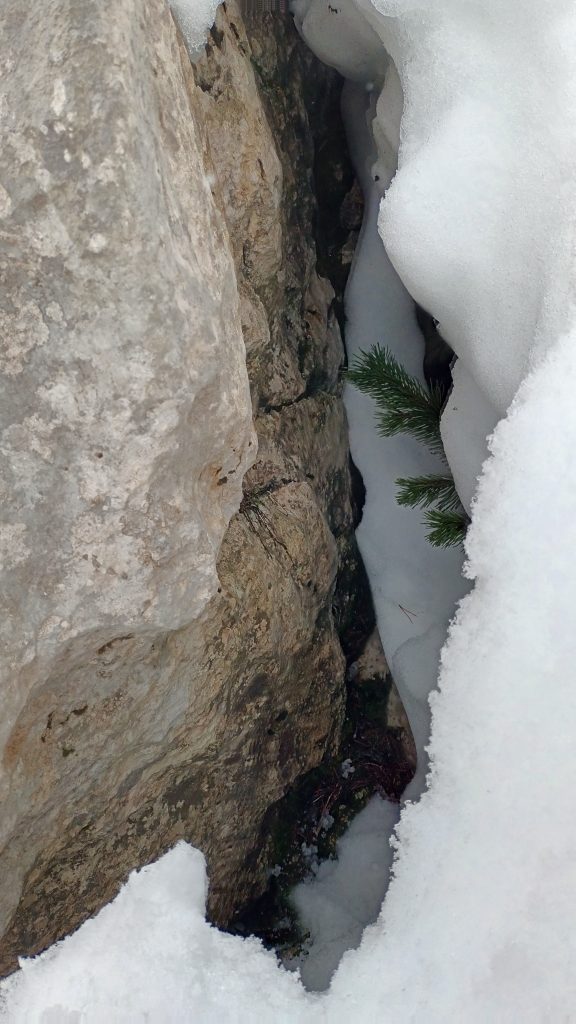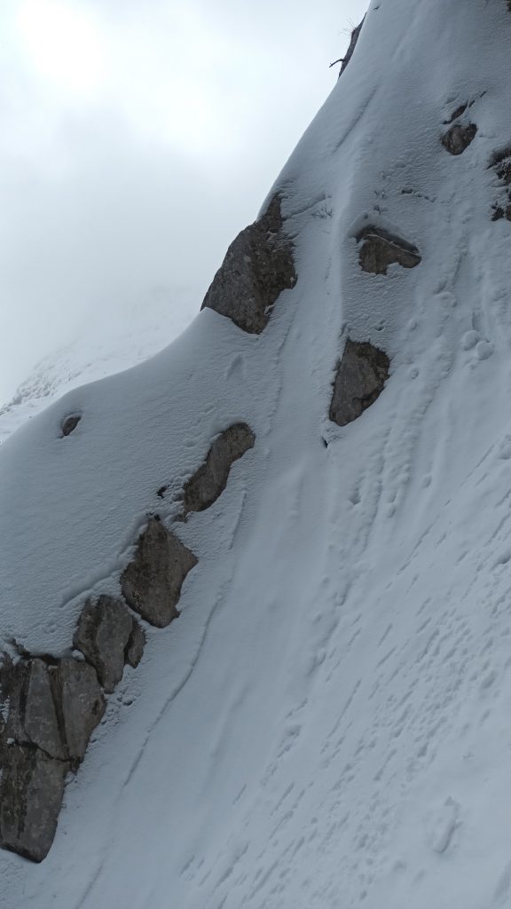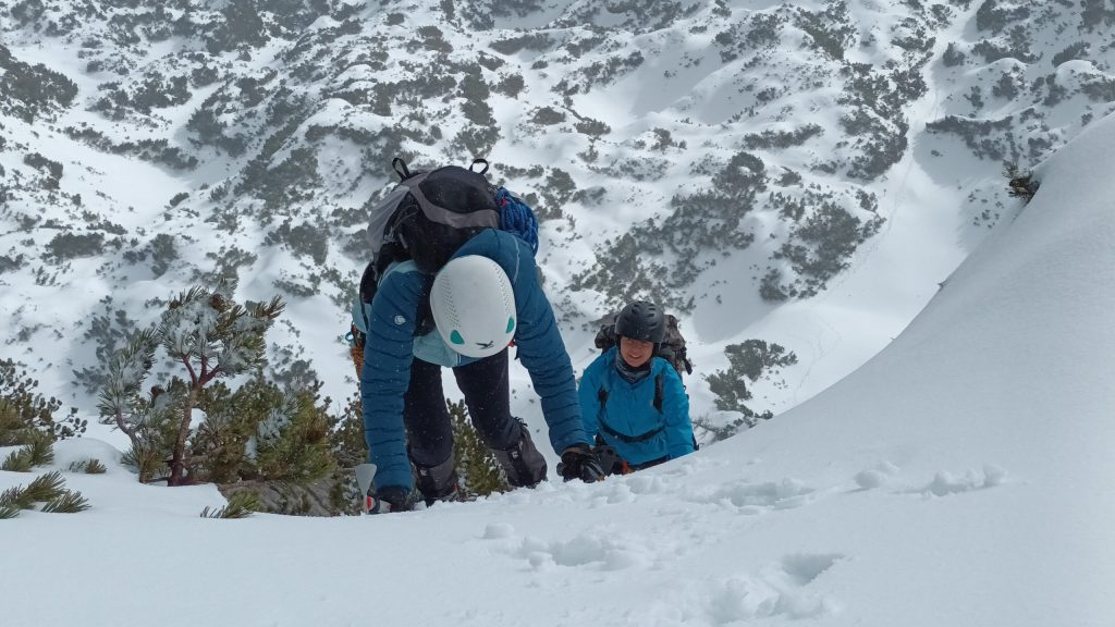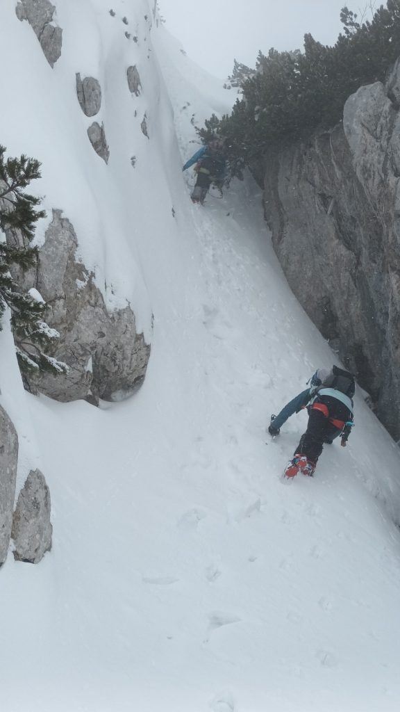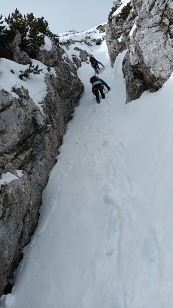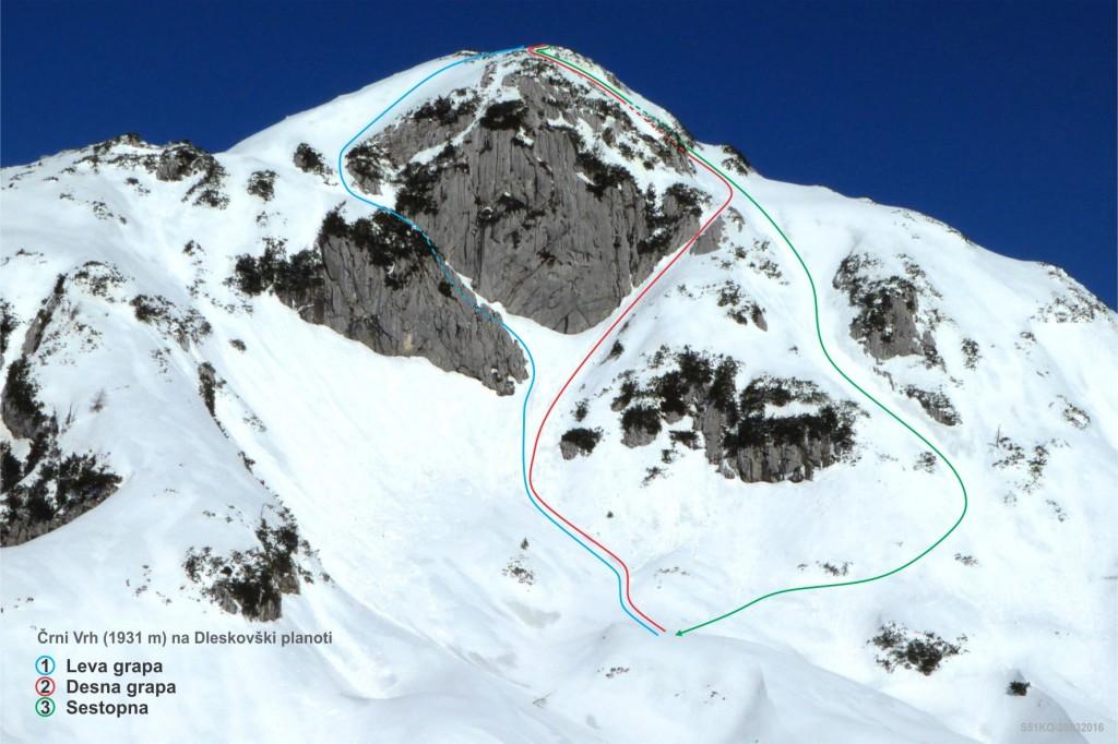 Še kratek vzpon in že se pred nami pokaže današnji cilj. Nato sledi še spust do pobočja po katerem pridemo do vstopov v grape Črnega Vrha. Poiščemo primerno mesto in se opremimo za vzpon: čelada, dereze, plezalni pas, cepin, rokavice, izjemoma plazovna žolna šele tukaj, saj snega, pa tudi nevarnega terena do sem skoraj ni. Preverimo delovanje žoln in preizkusimo še stabilnost snežne odeje. Kljub temu, da snega ni veliko, so snežne razmere v Levi grapi dobre, pravzaprav odlične. Sneg je pomrznjen kot beton, Desna grapa pa ni narejena. Mijo da še zadnje napotke in že zagrizemo v strmino. Dereze in cepin dobro primejo. Začetna negotovost kmalu popusti in vsak gib je bolj umirjen in siguren. Previdno, drug za drugim s primerno varnostno razdaljo se vzpenjamo po Levi grapi. Vseskozi upoštevamo pravilo treh opornih točk. Prva strmina je kmalu za nami. Sledi nekoliko izpostavljena prečka, nato pa zopet naprej po grapi do vrha. Na vrhu je začelo močneje pihati in višinski veter s seboj pripelje oblake iz katerih je začel naletavati sneg.