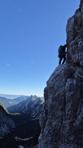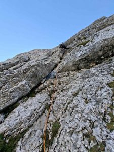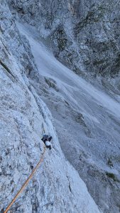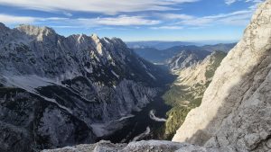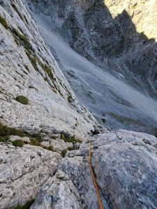 V soboto se zgodaj odpraviva do stene, kjer ob zori zagledava steno Šit in si dodobra ogledujeva potek smeri. Glede prvih dveh raztežajev, če potegneš prvi raztežaj samo do rdečega prusika je skica prava. Če pa potegneš prvi raztežaj nad prusika čez detajl in do zajede pa se skica ne izide. Sama smer je zelo lepa in tudi zelo dolga, ker po štriku narediš veliko več metrov od uradne dolžine. Ponuja dobro kakovost skale, prečke in izjemno lepe zajede s konstantno težavnostjo V. Višje v smeri strmina in težavnost za par cugov popusti potem pa se spet nadaljuje. Z orientacijo nisva imela večjih težav, prav pa so nama prišli frendi, jebice in tudi klini. V smeri sva pustila en klin. Po dobrih 9 urah stojiva na vrhu in si s soncem na obrazu čestitava. Sledi še dolg sestop, prvo do markirane poti in potem čez Jalovško škrbino v Tamar in od tam s kolesi v Planico :). Tukaj bi omenil pohvale vredno obnovitev poti čez Jalovško škrbino, zaradi nove zajle in dodatnih skob in klinov, ki so bile še čisto “frišne”.